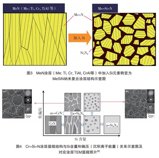 PVD技術(shù)制備Me-Si-N納米復(fù)合涂層的難點(diǎn)在于對(duì)納米相晶粒大小、形狀和分布、非晶相厚度的控制,等通過沉積涂層的成分和離子能量的控制(圖4),實(shí)現(xiàn)了納米復(fù)合涂層的可控生長;余東海等采用空心陰極和磁控濺射復(fù)合離子鍍技術(shù)制備了TiAlSiN、TiCrSiN多元納米復(fù)合涂層刀具,高速銑削淬硬鋼取得較好效果。