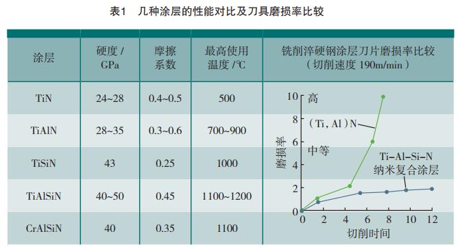 部分公司開發(fā)了納米復(fù)合結(jié)構(gòu)的刀具涂層。S.Carvalho等采用直流反應(yīng)磁控濺射方法制備了納米復(fù)合涂層刀具,并將該涂層與目前市場上適合高速切削的多層涂層(TiCN/Al2O3/TiN)的切削性能進(jìn)行了比較,結(jié)果顯示,TiAlSiN納米復(fù)合涂層刀具在Vc=200m/min的條件高速車削合金鋼,比TiN多層涂層刀具磨損小,且工件表面粗糙度小于4μm,比TiN多層涂層刀具加工的工件表面質(zhì)量(12μm)有很大提高。P公司的新一代nc-Ti1-xAlxN/(a-Si3N4)納米復(fù)合涂層刀具,是在強(qiáng)等離子體作用下,3nm的TiAlN晶體被鑲嵌在非晶態(tài)的Si3N4體內(nèi),晶粒之間為1nm厚的Si3N4。這種結(jié)構(gòu)使涂層硬度可達(dá)到50GPa,摩擦系數(shù)為0.45,且高溫硬度更是非常突出,最高使用溫度可達(dá)1100℃,溫度達(dá)到時(shí),其硬度值仍可保持在30GPa。日本公司開發(fā)的TiSiN涂層刀具(“TH”涂層)改善了加工高硬度材料時(shí),TiN涂層刀具長期以來未能解決的涂層氧化和硬度欠佳問題。用“TH”涂層刀具高速加工拉伸模材料(HRC62)時(shí)與TiAlN涂層刀具相比加工成本降低54%。表1列出了幾種納米復(fù)合涂層與傳統(tǒng)TiN和TiAlN涂層的性能對(duì)比。