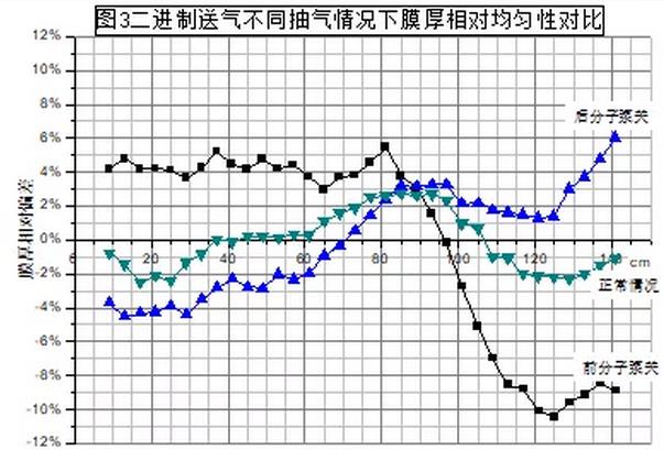 圖2是均勻抽氣不同送氣方式下膜厚的變化情況: