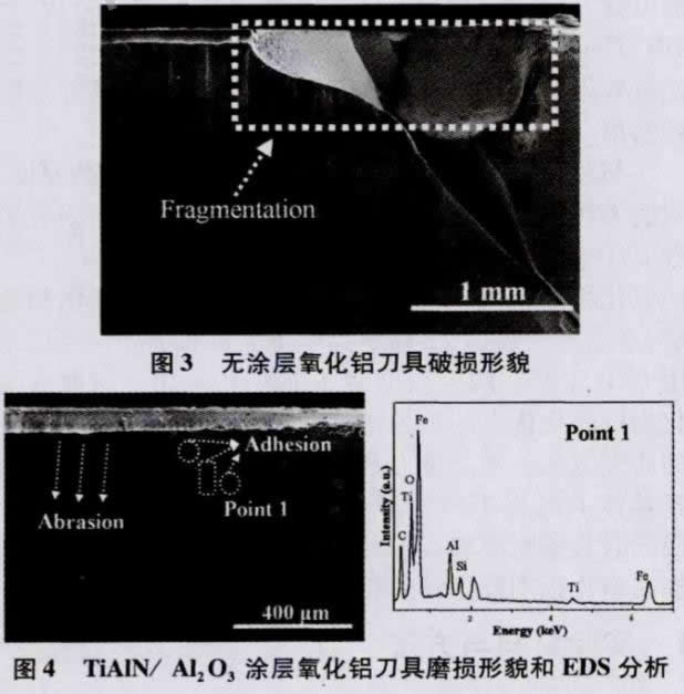 (2)高速干切削灰鑄鐵試驗中發(fā)現(xiàn),無涂層氧化鋁刀具不適合切削灰鑄鐵,加工時會發(fā)生崩刃破損;而TiAlN/Al2O3涂層氧化鋁刀具主要發(fā)生磨粒磨損和少量的粘結(jié)磨損,刀具使用壽命至少是前者的兩倍。