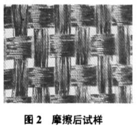 由圖2可見,經組織點處鈦膜的磨損明顯多于緯組織點,說明經紗摩損大于緯紗,這與經、緯紗性質及織物結構有關。試樣中經、緯紗細度相差不大,但經密明顯大于緯密,造成經紗屈曲波高(h1)大于緯紗屈曲波高(hw),故而試樣表面經組織點比緯組織點更突出。對鍍膜試樣進行平磨時,經組織點與磨料的接觸比緯組織點充分,使得經組織點處鈦膜磨損更嚴重。