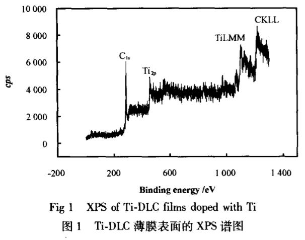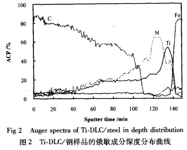圖1所示為摻鈦類金剛石(Ti-DLC)薄膜的XPS譜圖可以看出:薄膜中除碳以外,還存在鈦(含量為6.8at%),Ti2p的特征峰位于455.1eV處,大于Ti值453.7eV,小于TiO,值458.7eV,可以判斷在非晶類金剛石薄膜中含有微晶TiC相,圖2所示為在鋼基體上所制備的Ti-DLC1(為了避免基體中Ti的干擾,采用鋼基體)樣品成分沿深度分布的曲線可見,膜層依次為Steel/Ti/TiN/TiCN/TiC/Ti-DLC,其中小于5at%的信號為儀器基底噪聲所致,同時,所含少量N可能是由于本底真空度(5×10-3Pa)不高而殘存一定空氣所致.在TC4基體上所制備的薄膜厚度約為2.81um,膜層的硬度HV0.1.25為6.51Pa(HV0.01.25=19.8GPa),膜/基結(jié)合力約44N。