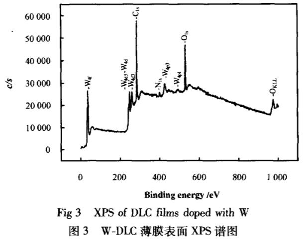 圖3所示為摻鎢類金剛石(W-DLC)薄膜的XPS譜圖可以看出:薄膜中除碳以外還存在鎢(含量為7.0at%),W4f的特征峰位于31.9eV處,大于w值31.4eV,小于WO2值32.8eV,而一般WC的處于31.5~32.8eV,可以判斷在非晶類金剛石薄膜中含有微晶WC相;同時薄膜中還含有少量氧及氮,估計是表面吸附污染所致,其梯度過渡層與Ti-DLC相同,只是最表層為W-DLC.在TC4基體上制備的薄膜厚度約2.83um,膜層硬度日HV0.1.25為8.78Pa(HV0.01.25=24.7GPa),膜/基結(jié)合力為60N。