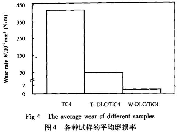 圖4所示為TC4基底、Ti-DLC/TC4及W-DLC/TC4薄膜的平均磨損率(該數(shù)據(jù)是在保載條件下計算出的,分別為TC4在200N摩擦15min;Ti-DLC/TC4在200N摩擦150min;W-DLC/TC4在300N摩擦1200min),可見:TC4基底的磨損率遠高于經(jīng)DLC涂層處理的試樣;而在DLC涂層的處理中,W-DLC薄膜的磨損率更小,表現(xiàn)出良好的耐磨性,這是由于表面經(jīng)DLC處理后硬度明顯增大,其整體承載能力增強,故其磨損深度較小,對基體材料起到了有效的保護作用,而W-DLC/TC4的硬度最高,且由于W-DLC膜層中含有WC微晶,故其體現(xiàn)出更優(yōu)良的耐磨性。
