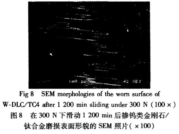 圖8所示為W-DLC/TC4在漸進加載(漸進方式如圖5上半部)至300N(為了加速試驗,選用更高載荷)保載滑行1200min后(未完全失效,停止試驗)的磨損表面局部形貌SEM照片可見:在磨痕區(qū)域主要為滑動磨損,磨粒磨損痕跡較少,磨痕很淺,這主要是由于W-DLC/TC4的承載能力較高,膜層硬度高、膜/基結(jié)合強度大的緣故,因此,經(jīng)過更高載荷、更長時間后,W-DLC/TC4體現(xiàn)出比Ti-DLC/TC4更優(yōu)異的耐磨性。