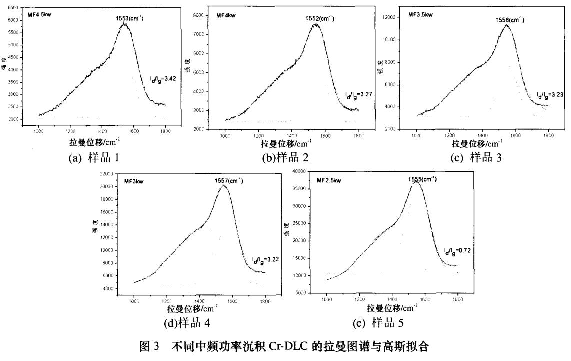 圖3為不同中頻功率沉積Cr-DLC的拉曼光譜分析。圖中樣品拉曼譜具有明顯的類金剛石譜線特征。G峰在1550cm附近,對應石墨相C-C鍵,隨中頻功率減小向高波數(shù)位移;D峰為肩峰在1350cm-1附近,對應無序sp3碳鍵。拉曼光譜對應同種原子的非極性鍵振動,中頻功率低則減小了膜層中Cr的含量,碳碳鍵相對含量增加使拉曼譜散射強度提高。G峰在1550cm-1附近表明鍵角寬化,sp3與sp2雜化鍵混合存在。類金剛石中sp鍵減小,則拉曼譜中G峰向高波數(shù)位移同時ID/IG比值增大。采用高斯擬合得樣品ID/IG與G峰位置如圖4,隨中頻功率提高,ID/IG增大且G峰向低波數(shù)略有位移,則隨中頻功率減小膜層中sp3增多。但3kW以后摻入的Cr量對C-C鍵影響不大。
