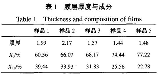 膜層表面致密均勻,無液滴顆粒,在大片不銹鋼沉積的大面積膜層均無麻點,表面光潔呈亮黑色鏡面。采用方形靶及長條無燈絲離子源輔助沉積保證的大面積膜層質(zhì)量的均勻統(tǒng)一。表1列出膜層厚度表面EDS成分分析結(jié)果,在高功率時樣品較厚在2m左右,功率減小膜厚變薄。可知隨中頻功率的減小膜層中Cr的相對含量降低,C的相對含量增加。沉積腔體內(nèi)c源提供不變,中頻功率大則離子離化率提高,同時離子能量增大,增強了對Cr靶的濺射,提高了Cr的濺射產(chǎn)額,膜層中Cr的相對含量提高。