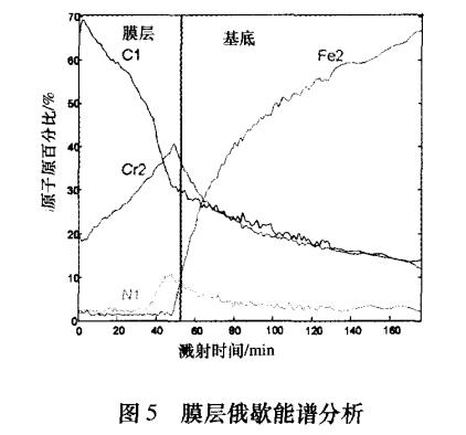如圖5為俄歇能譜對膜層成分深層分布進行剝層分析的結(jié)果。整個膜層剝層時間為180min,由表層開始c量下降,Cr量上升,在界面處Cr升到最大;在剝層30min后N信號出現(xiàn)并漸漸上升,接近界面處N開始下降;50min后鐵信號出現(xiàn)表明濺射到基底。由圖可證明膜層的多層結(jié)構(gòu):上述場發(fā)射掃描電鏡結(jié)果可知無定形結(jié)構(gòu)僅為總膜層的一半,濺射25min之前為Cr-DLC;在25min到30min之間僅有C和Cr出現(xiàn)為CrC層;從30min到界面附近出N信號且C信號減小并接近基底含量,為CrN/CrNC層;界面處Cr信號最大為一層很薄的金屬Cr層。圖中的元素均呈漸進變化,保證了膜層成分和性能的平穩(wěn)過渡,降低薄膜沉積過程中產(chǎn)生的各種應力,提高了膜層質(zhì)量。