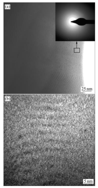 圖11所示為DLC/WC膜層的微觀結(jié)構(gòu)。由圖11可見,在本研究中,所制備的DLC/WC薄膜,微觀上存在DLC/WC層狀結(jié)構(gòu)。該處的TEM微區(qū)電子衍射環(huán)很弱,這進一步說明了膜中的WC和W2C量少并且晶粒非常細小(見圖11(a))。每一DLC/WC調(diào)制周期約為4nm,層間界面不是非常清晰(見圖11(b)),這主要與膜層的沉積方法有關(guān);該調(diào)制周期小的納米多層結(jié)構(gòu)有利于降低膜層內(nèi)應(yīng)力和提高膜層硬度。