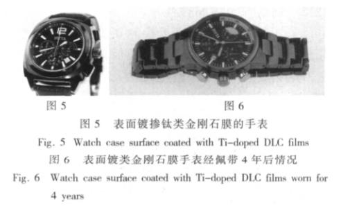 將表面鍍Ti-DLC膜的表殼及表帶若干件人工汗實驗48h后,膜層的整體顏色無發(fā)生變化、沒有出現(xiàn)鹽析和銹蝕現(xiàn)象。