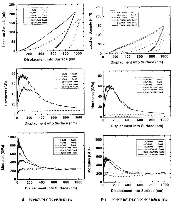 為了便于比較,9Cr18在深度為1um處對應的載荷、硬度、模量平均分別約為170nM,8GPa,245GPa,40CrNiMo的值分別為120mN,5.5GPa,500GPa。9Cr18的硬度和模量高于40CrNiMo,見圖1和圖2,由于DLC膜的厚度只有0.2um,必須依靠硬基體來承受外加載荷,這里需指出的是,納米壓痕硬度的定義為在某一壓入深度或時刻的壓痕投影上單位面積所承受的力,它是樣品對接觸載荷承受能力的度量,納米壓痕硬度是通過測量出壓痕深度后再根據經驗公式計算出接觸面積。