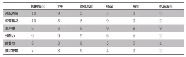 由雷達(dá)圖看出,陽極氧化的綜合特性優(yōu)異,沒有特別明顯的缺陷,特別是其外觀質(zhì)感最佳,國內(nèi)生產(chǎn)廠家眾多,技術(shù)成熟;尤其適合3C產(chǎn)品的大規(guī)模應(yīng)用。目前,陽極氧化是鋁和鋁合金材料應(yīng)用最廣且最成功的技術(shù)。