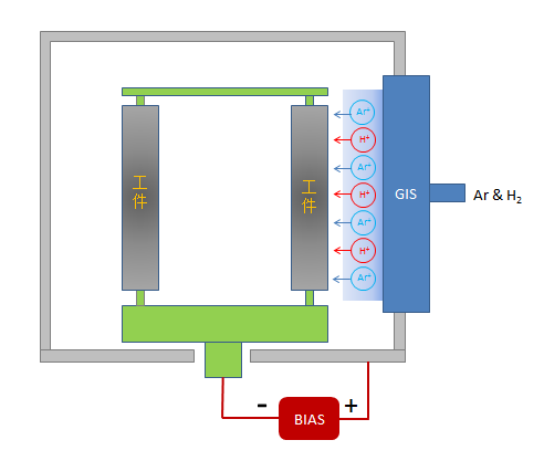 ① 在涂層前,利用GIS氣體離子源將氬氣和氫氣離化,產生的氣體離子(Ar+和H+)在偏壓作用下,對產品表面進行刻蝕清洗;
